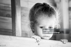 Little sad girl on the playground. Black and white series.